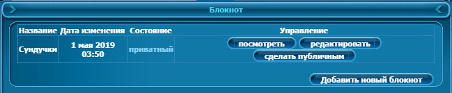 Данный модуль позволяет вам создавать заметки, редактировать их, а так же публиковать свои записи в анкете персонажа в отдельном блоке.