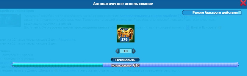 Вы можете переключить "Режим длительного действия" на "Режим быстрого действия" и сразу использовать предметы несколько раз. Отлично подходит для открывания редких сундучков, массового взлома и производства ресурсов.