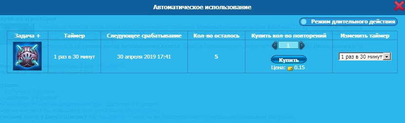 Одним из лучших модулей нашей игры является - Автоматизация действий. Благодаря этому модулю вы можете ставить предметы на автоиспользование (Например использование Репликатора материи 1 раз в сутки в автоматическом режиме). Данная функция является платной, однако по доступной каждому цене. Вы покупаете "Повторения" и создаете задачи для запуска автоматических действий. Данный модуль работает, даже если вы находитесь вне игры.