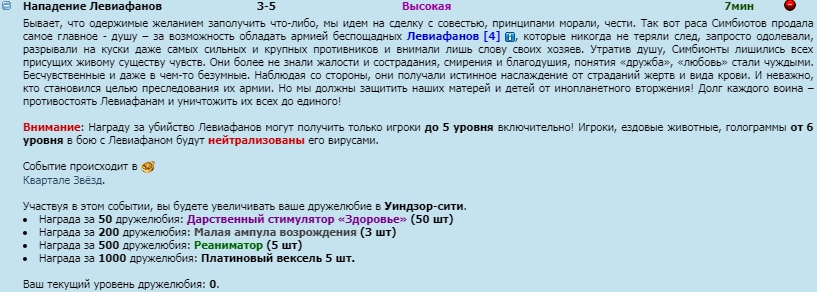 Кликнув на "+" возле события вы можете развернуть полное описание и ознакомиться с информацией о том, что происходит во время события, в какой локации проходит событие, а также дружелюбие какого сектора будет улучаться при вашей активности на событии.