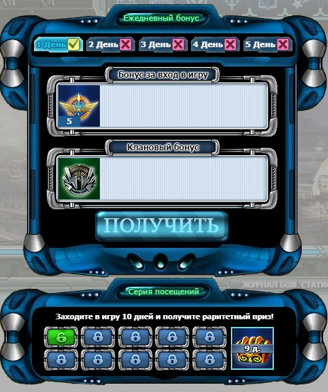 За вход в игру, вы получаете приятные бонусы, размер которых будет расти при непрерывном и ежедневном посещении. После получения высшей награды счетчик сбрасывается. А так же завершив серию из 10-ти суток вы получите дополнительную награду!