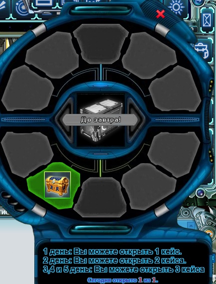 После того, как вы выбрали пункт "Космическая удача" слева появится панель с закрытыми кейсами. Вы можете открыть любой/любые предоставленные кейсы. Количество кейсов зависит от суточной серии, которая состоит из 5-ти дней.